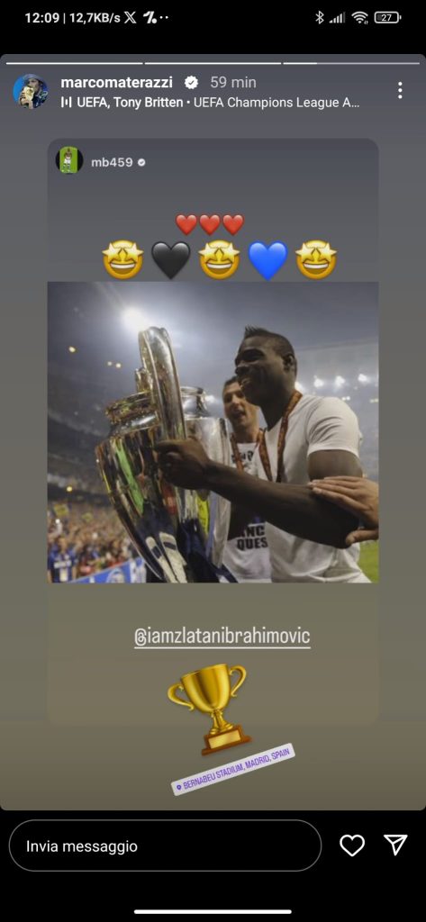 L’ex capitano dell’Inter Marco Materazzi ha postato sul suo profilo Instagram la stessa storia di Balotelli mettendo dei cuori nerazzurri sulla fotografia della Champions League del 2010.
