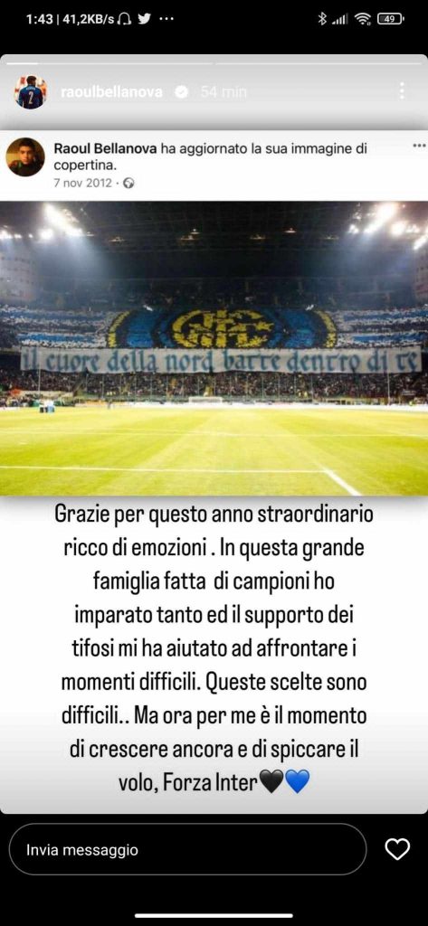 Ecco le sue parole su Instagram sottolineando l’onore di aver giocato con la squadra del suo cuore.