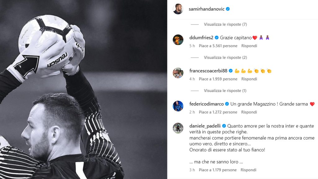 Con una lunga lettera pubblicata sul proprio Instagram, Samir Handanovic ha salutato l’Inter e tutte le persone con le quali ha condiviso questo lungo cammino in nerazzurro. Sotto al post, alcuni suoi ex compagni hanno voluto mostrare la propria vicinanza al capitano.