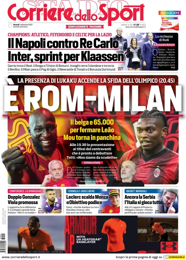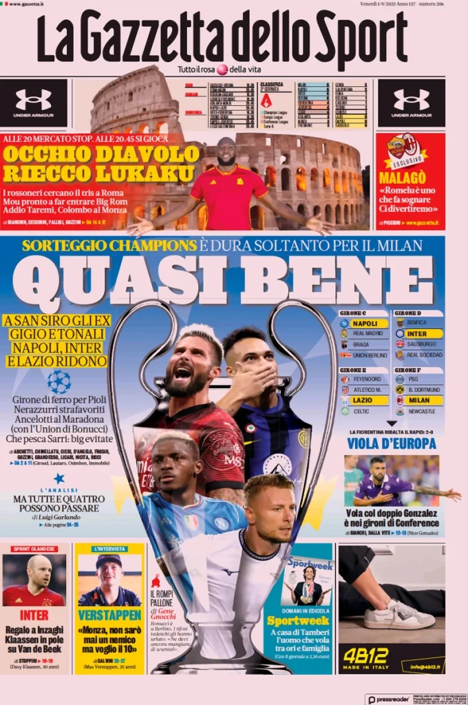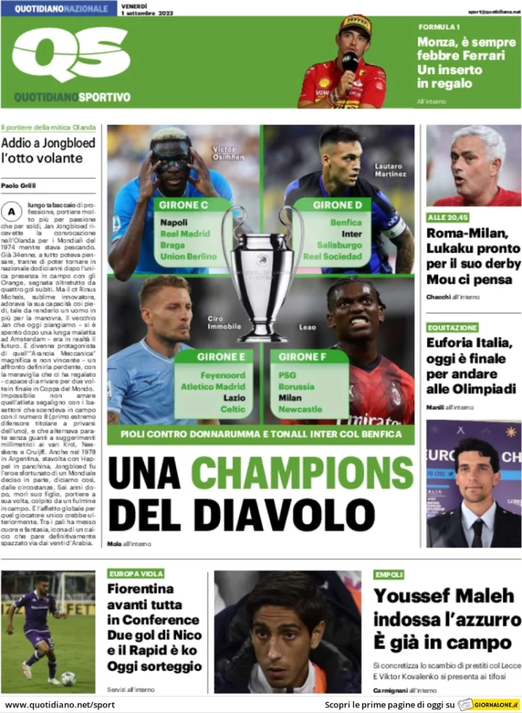 Ecco le prime pagine sportive di oggi, 1 settembre, in edicola: Gazzetta dello Sport, Corriere dello Sport e Tuttosport. Focus sui sorteggi Champions e sul cammino europeo che attenderà Inter, Milan, Napoli e Lazio.