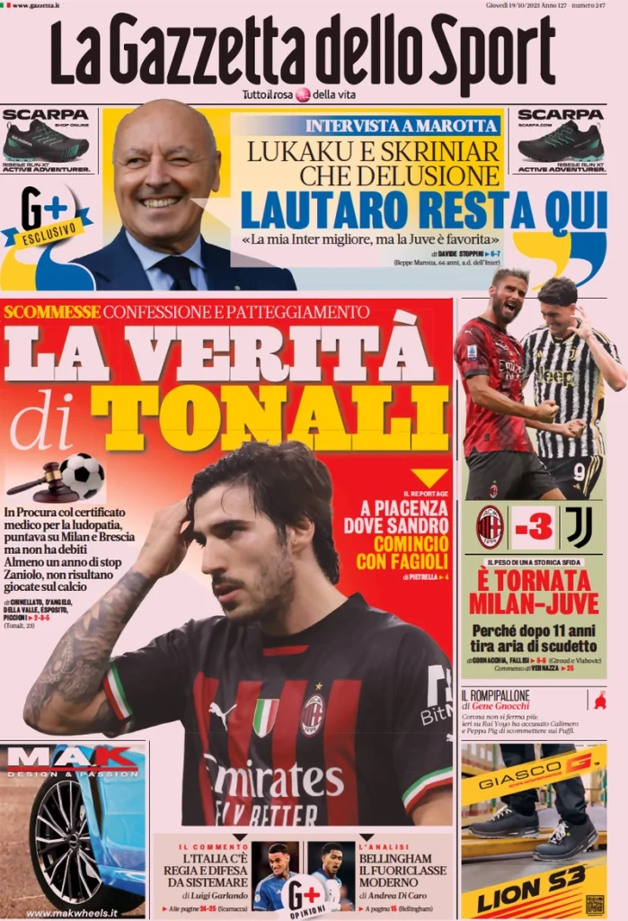 Ecco le prime pagine sportive dei principali quotidiani nazionali di oggi, 19 ottobre, in edicola. Focus sul caos scommesse che ha travolto la Serie A e sulle dichiarazioni dell’ad nerazzurro Beppe Marotta.