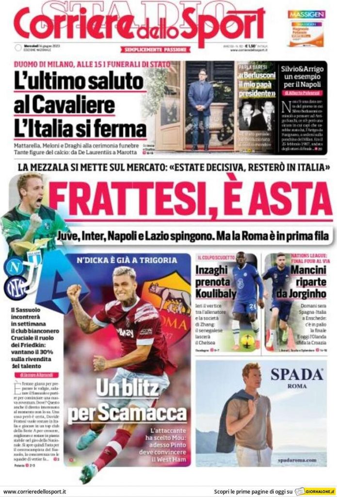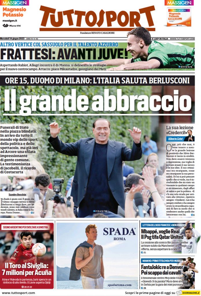 Ecco le prime pagine di oggi, a tema calciomercato Milan e sui funerali dell’ex Presidente rossonero Silvio Berlusconi.